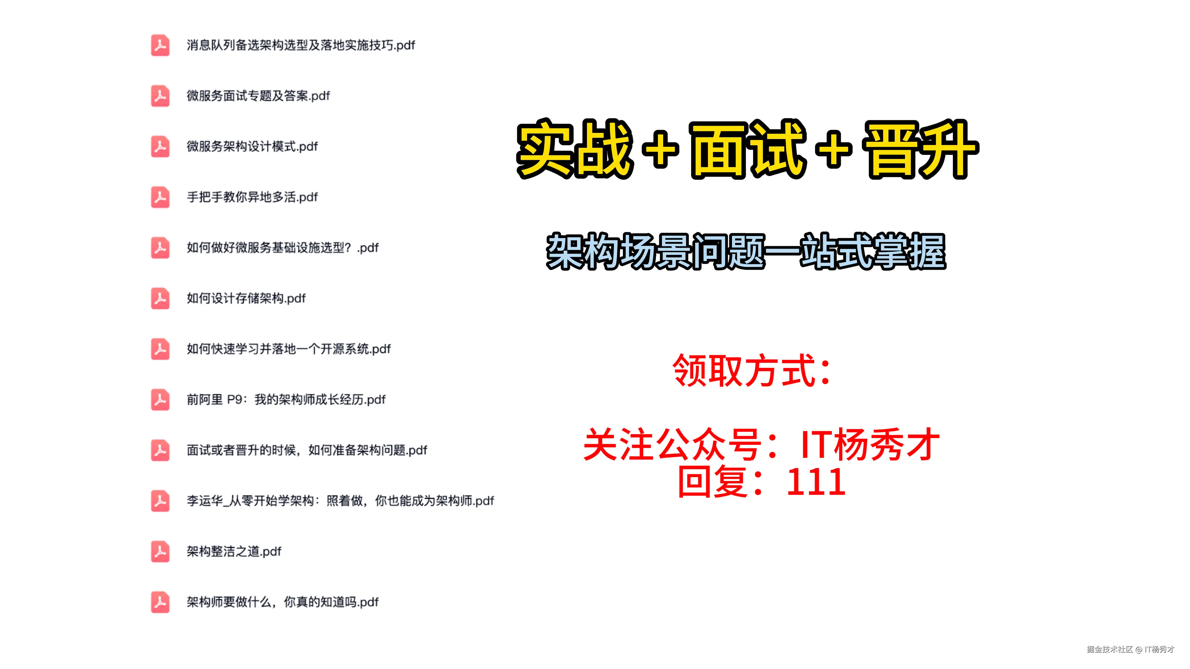 随着AI发展越来越快,AI编程能力越来越强大,现在很多基础的写接口,编码工作AI都能很好地完成了。并且现在的面试八股问题也在逐渐弱化,面试更多的是查考候选人是不是具备一定的知识体系,有一定的架构设计能力,能解决一些场景问题。所以,不管是校招还是社招,这都要求我们一定要具备架构能力了,不能再当一个纯八股选手或者是只会写接口的初级码农了。这里,秀才为大家精选了一些架构学习资料,学完后从实战,到面试再到晋升,都能很好的应付。关注秀才公众号:IT杨秀才,回复:111,即可免费领取哦