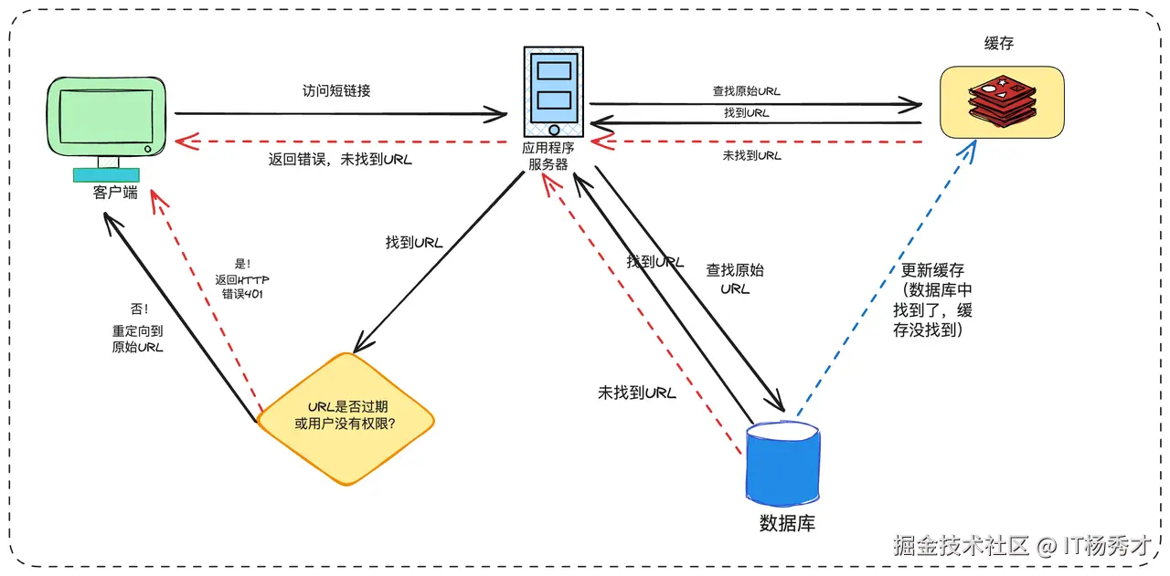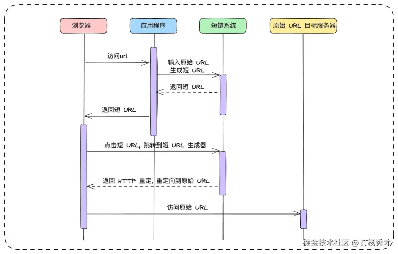 重定向:浏览器访问短链系统,系统查询到原始长URL后,返回一个HTTP 302重定向响应,浏览器随即访问原始的URL目标服务器。