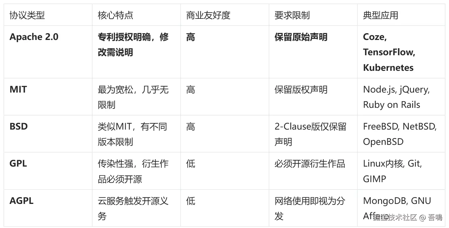 Apache 2.0并非唯一的选择,开源世界中有多种常见的许可协议,各有其设计哲学和适用场景。