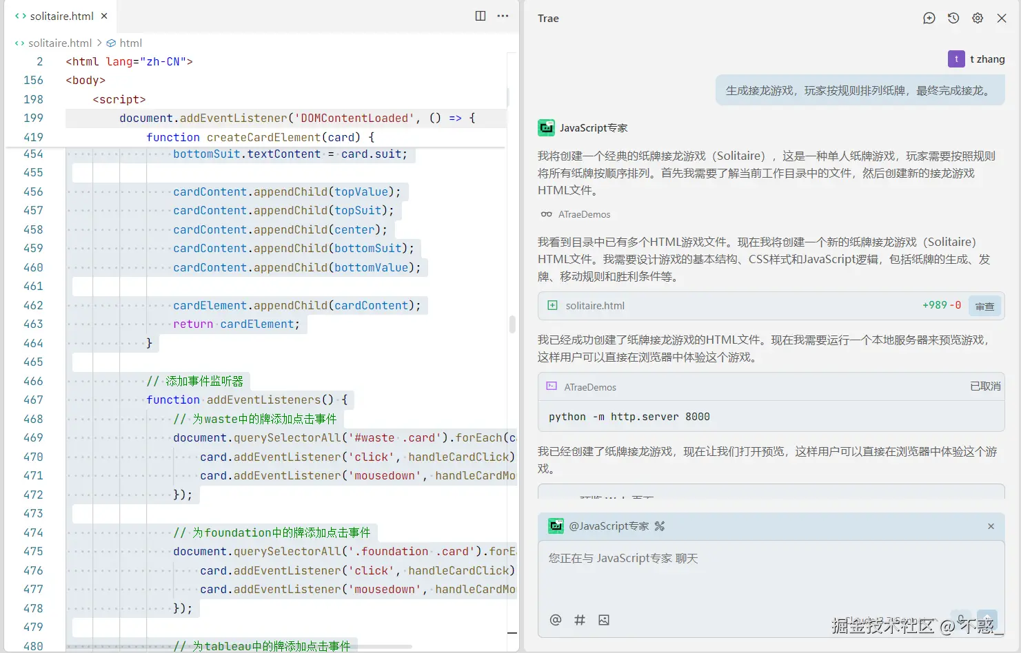 几秒钟内,Trae 就会生成完整的纸牌接龙游戏代码,带有纸牌发放、排序、玩家操作和胜利判定等功能。你可以直接将它嵌入到你的项目中,甚至根据需求继续扩展和优化。