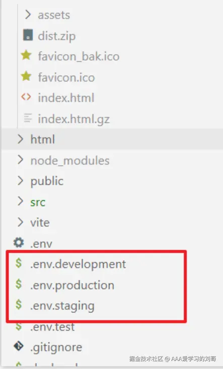 在前端项目中也有多环境配置,如下面的三个文件,不同的文件对应了不同的环境配置项