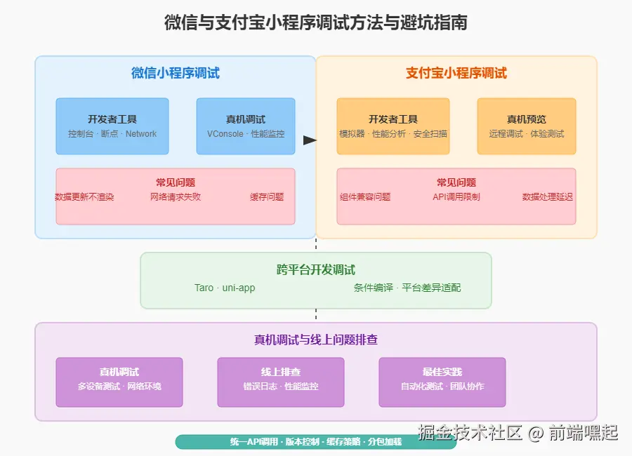 对于同时开发微信和支付宝小程序的团队,跨平台框架是不错的选择,但也带来了新的调试挑战: