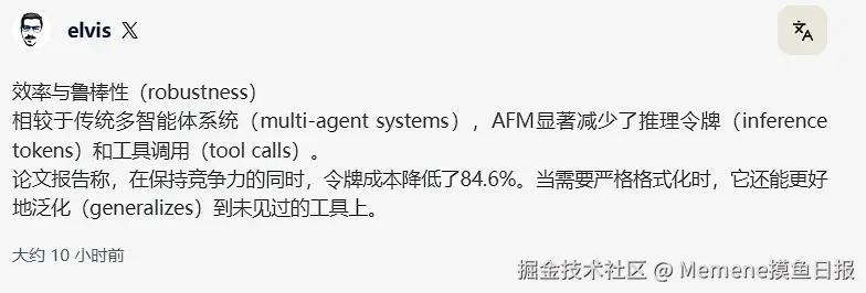 Chain-of-Agents(代理链)技术实现了重大突破 ,通过多智能体蒸馏与智能体强化学习的结合,成功训练出具备多代理系统能力的单一基础模型。该模型在保持竞争力的同时,显著减少了推理令牌和工具调用,令牌成本降低了惊人的 84.6%。