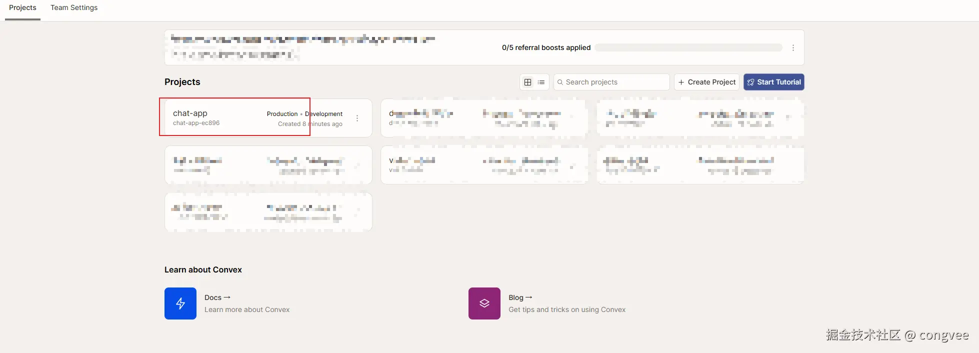 结束后项目根目录下会生成配置文件:.env.local ,并且看板会生成新的convex项目: