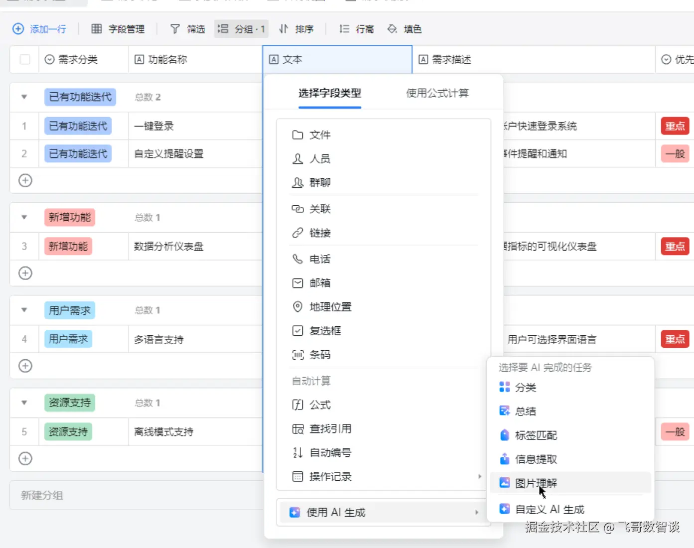 该字段能基于同一行的其他数据,通过大模型自动分析并生成内容。