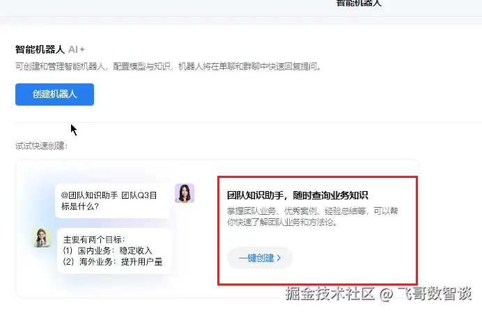 电脑端和移动端相同:打开“工作台”导航,找到“智能机器人”应用,点击进入,然后创建机器人即可。