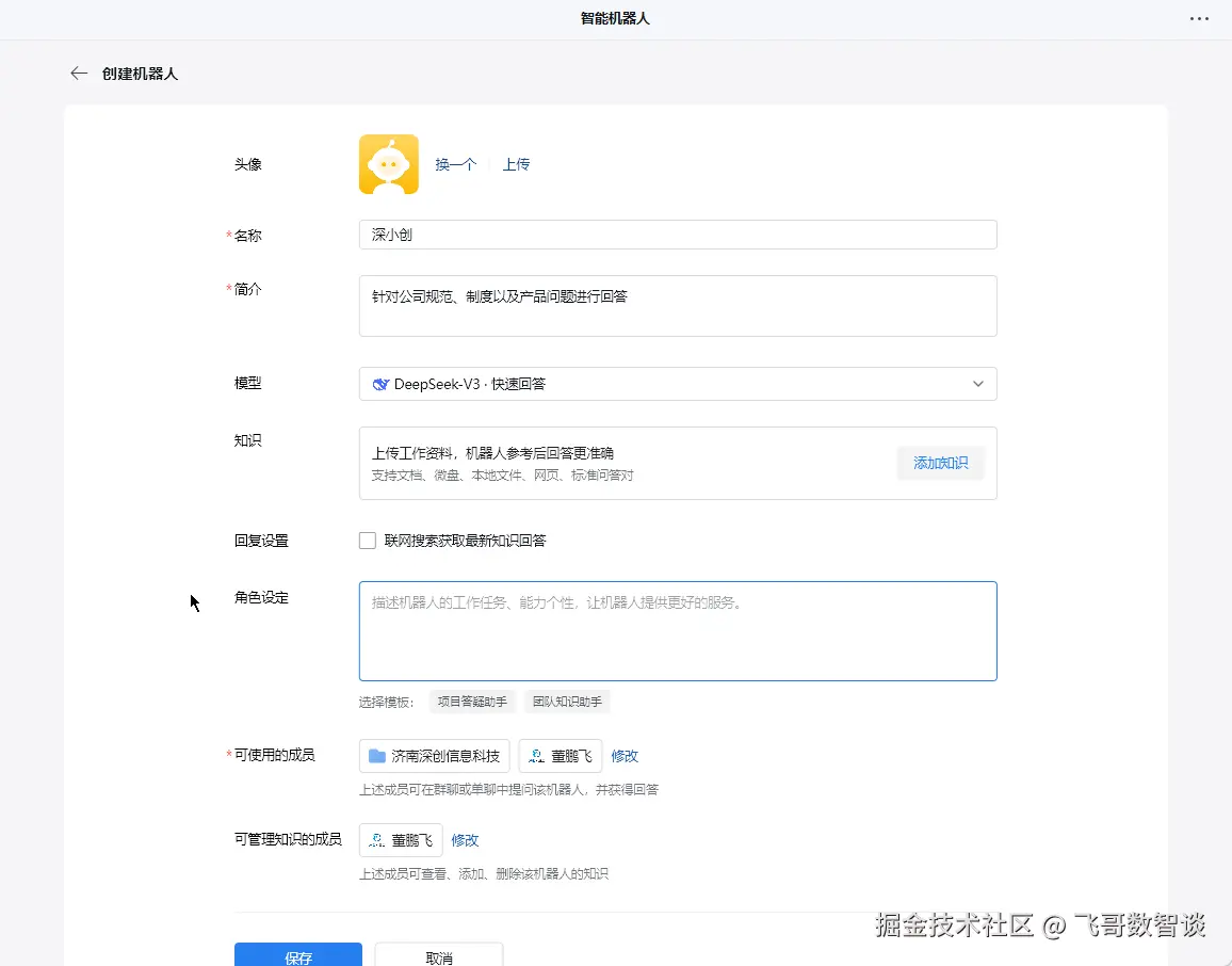 可以为特定的群组(如部门群、项目群、新员工群)创建一个“AI机器人”。通过配置知识库(上传文档、设置问答对),机器人能自动回答成员的常见问题,实现7x24小时在线答疑。