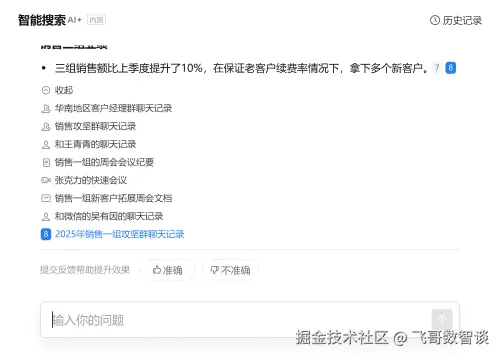 有了“智能搜索”,再也不用在无数聊天窗口和文件夹里“人肉翻找”了,结果也不是简单列举,而是 AI 根据问题进行的回答,更加简洁高效。