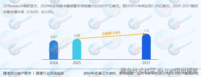 根据QYResearch最新调研报告显示,2024年全球脉冲晶闸管市场规模为0.97亿美元,预计2031年达1.30亿美元,CAGR为3.6%。历史数据显示,2020-2024年行业受全球供应链波动影响,增速波动于2.8%-4.2%之间,但2025年后随着5G基站建设加速(预计2025-2031年全球5G基站数量CAGR达15%)与工业自动化升级,需求将稳步回升。