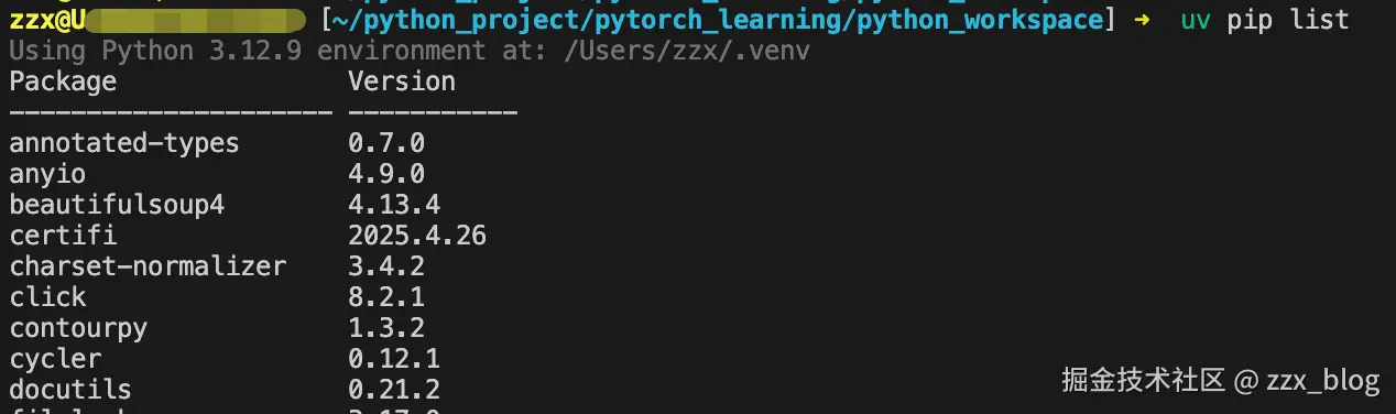 这里可以输入或者通过访达选择。我直接输入了/Users/zzx/.venv/bin。 然后回车就可以了。这样就会使用uv管理的虚拟环境了。缺失依赖的warning也就会消除。