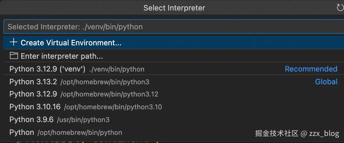 vscode会把当前环境下面能找到的python解释器都列出来。如果当前目录下面有虚拟环境也会优先推荐列举出来。