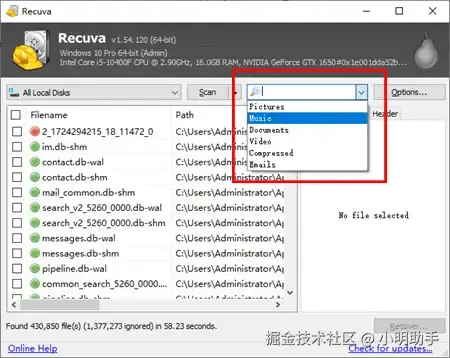 第2步: 等待扫描文件出现后,我们也可以根据类型进一步筛选文件;比较可惜的是,这款软件的文件预览功能不够数据 蛙恢复专家完备,需要我们认真通过数字信息找到目标文件。