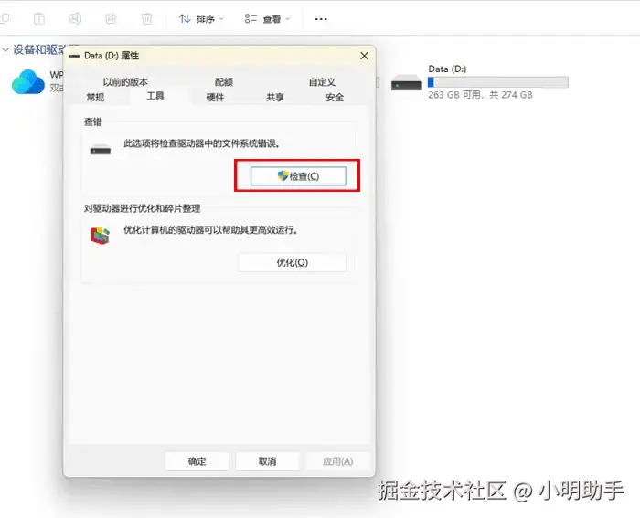 第2步: 在属性界面中点击上方的【工具】,进入查错板块后点击【检查】。