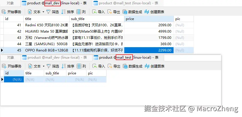 mall_dev和mall_test,mall_dev中的product表包含商品数据,mall_test中的不包含商品数据,我们将把mall_dev中的数据同步到mall_test中去;
