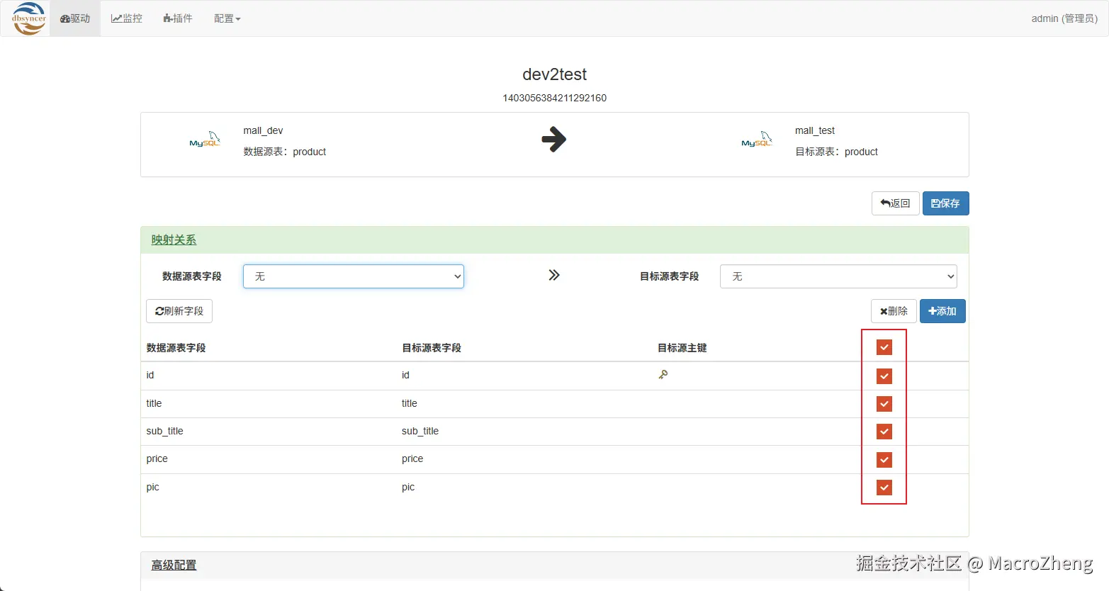 - 然后配置好字段的映射关系,如果是所有字段都需要同步的话全选即可;