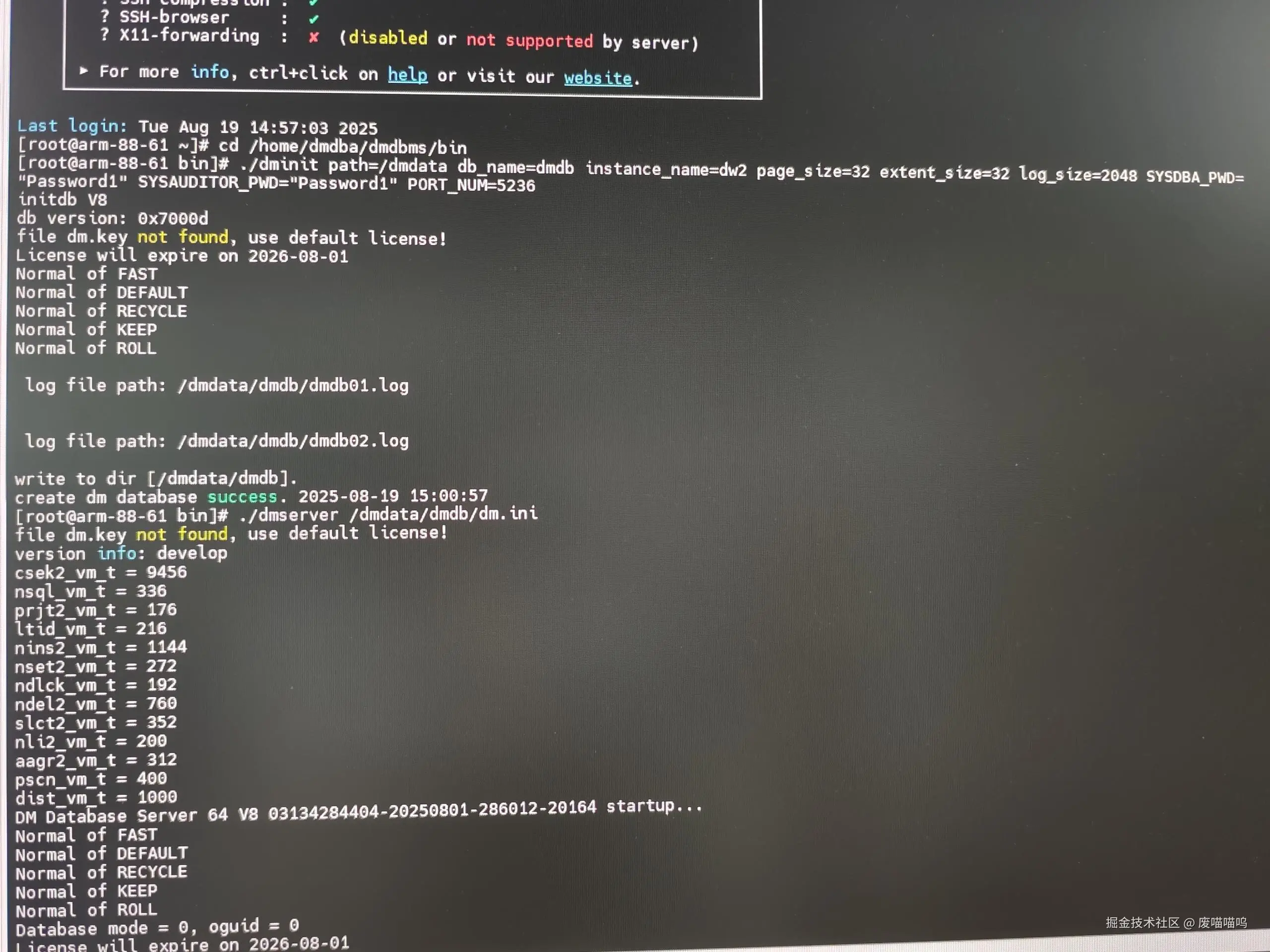 ./dminit path=/home/dmdba/dm8/dmdbms/data db_name=dmdb instance_name=dw1 page_size=32 extent_size=32 log_size=2048 SYSDBA_PWD=Password1 SYSAUDITOR_PWD=Password1 PORT_NUM=5236