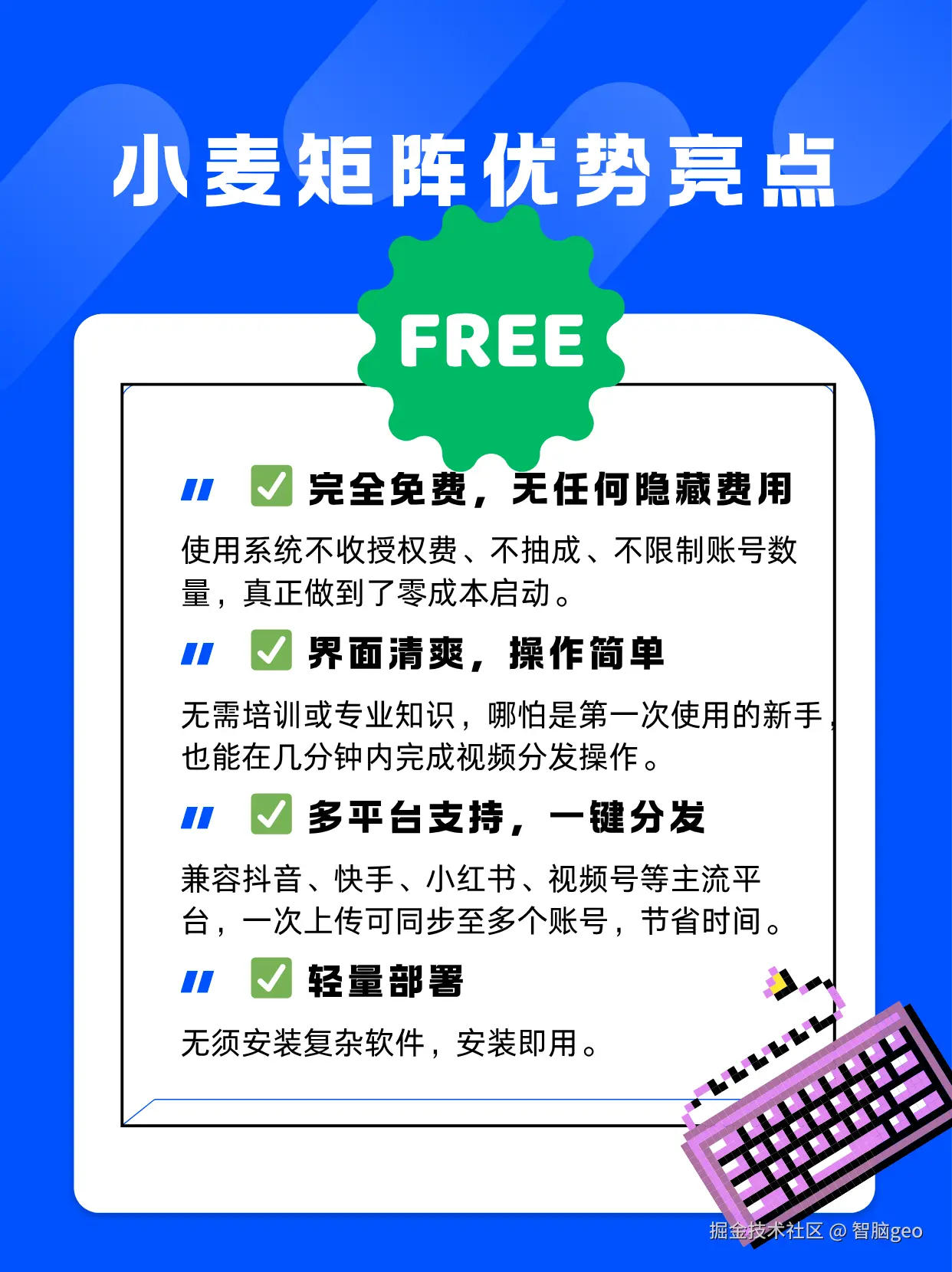 无论你是个人创作者、MCN机构还是跨境电商,选择小麦矩阵系统,都能帮助你用更低成本、更高效率抢占流量高地。