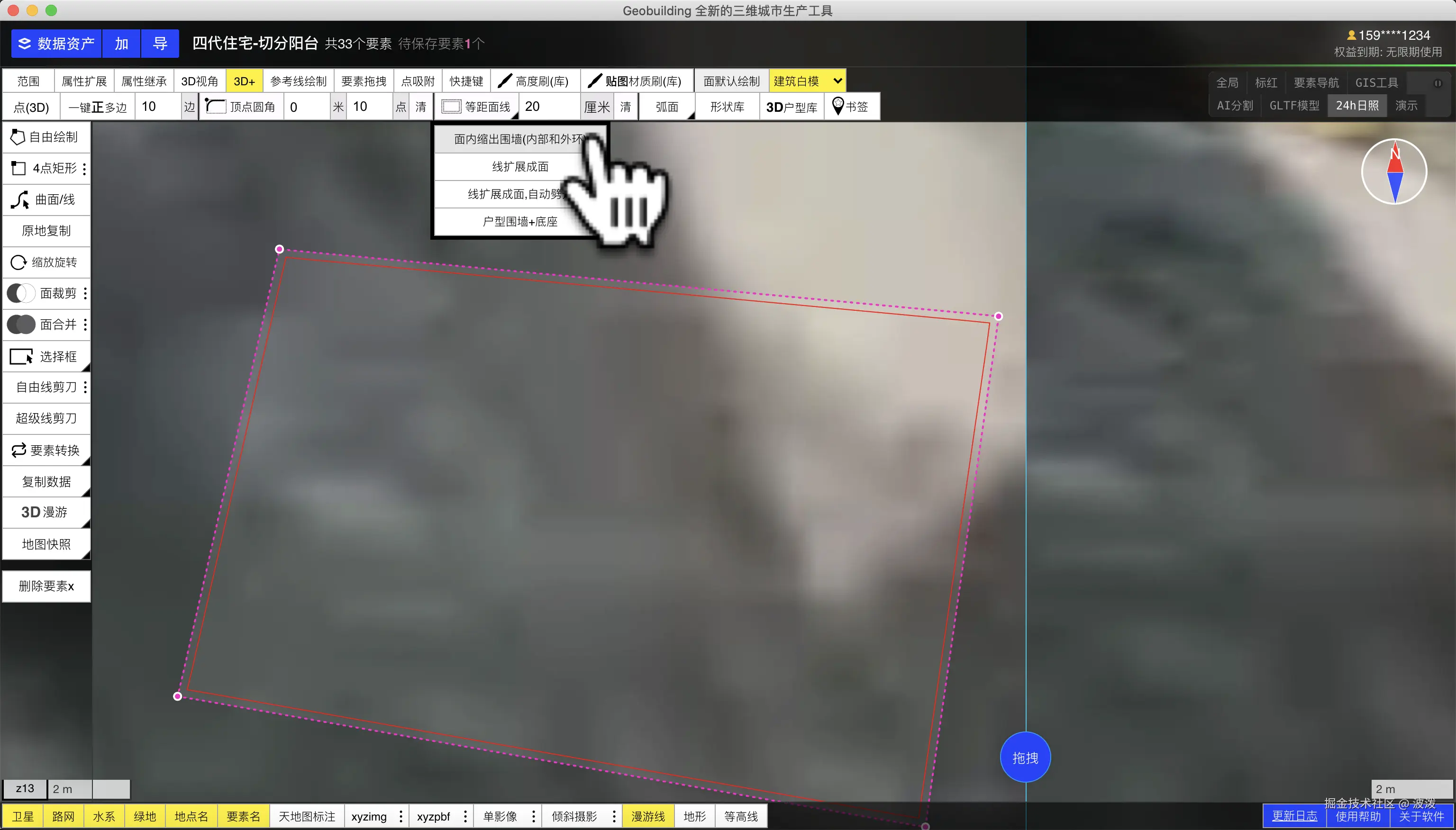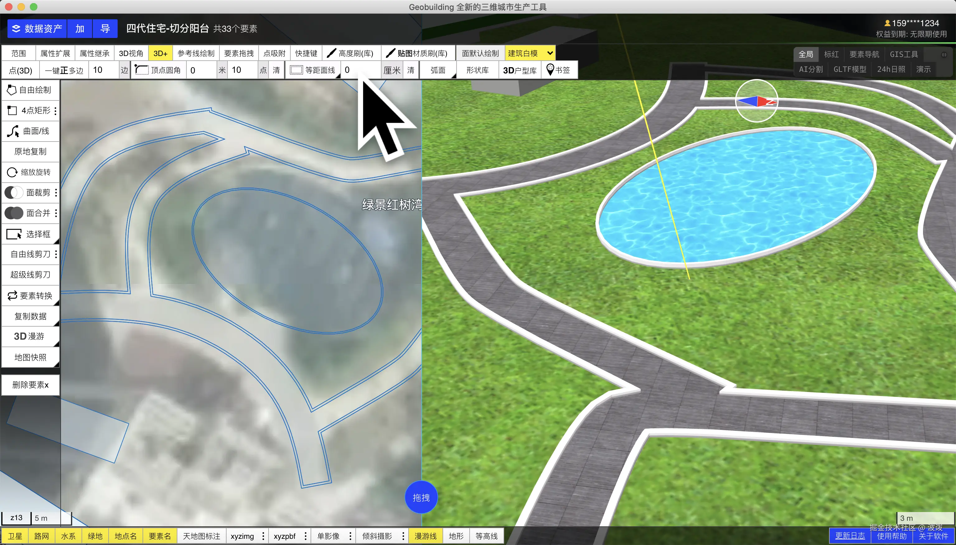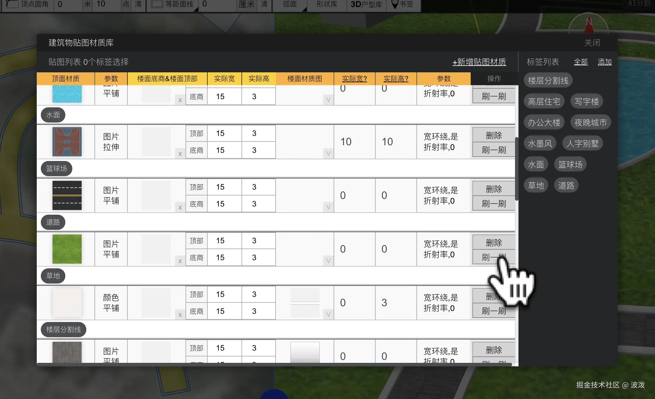 白模建筑贴图-小围墙,道路水池草地场景 波泼 2025-08-21 75 阅读1分钟 该操作支持shp白模、geojson白模贴图,并导出成三维模型 gltf obj格式 效果如图 如何做到的? 软件内支持对建筑贴图,首先要将轮廓设置成建筑类型。设置很低的高度。 接着使用内置材质库,在右侧场景点击上面的超低建筑面,即可上材质 这里的边缘墙体是如何制作的? 选择一个轮廓,设置等距面线,设置墙体厚度20厘米。然后点击这里的 [出围墙选项]