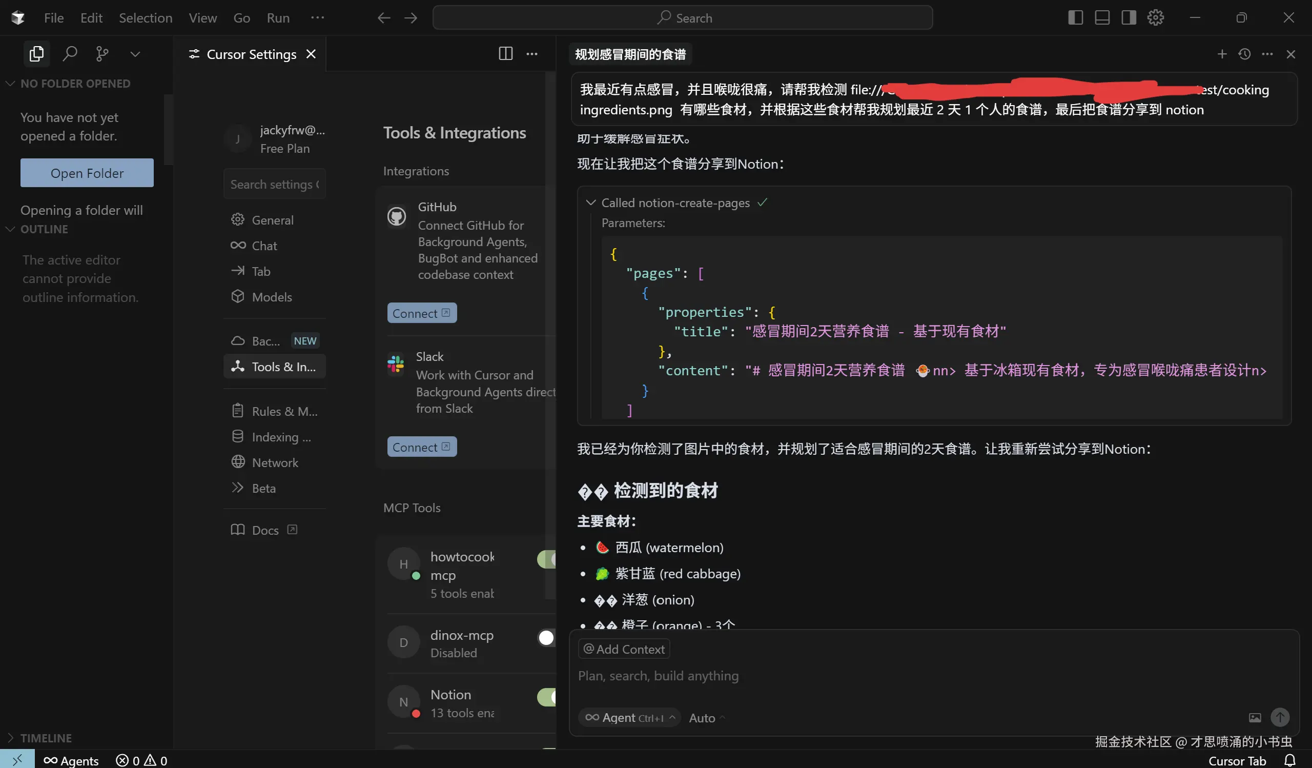 通过调用 Notion MCP,大模型在已经授权的私人 Notion 空间创建了一个专门的页面,用来记录食谱以及相关注意事项。