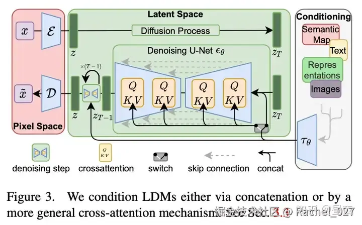 latent diffusion model 由三部分组成:像素空间(Pixel Space)、潜空间(Latent Space)和条件(Conditioning)。大体过程如下,图片x在像素空间中通过变分自编码器(VAE)的encoder进入潜空间中,得到z。z在潜空间内先经过正向加噪过程得到z_T,之后z_T与条件进行交叉注意力(cross attention),一起输入到U-Net中进行去噪过程。经过去噪过程后得到的z输入到VAE的decoder中,生成重建图像x~。