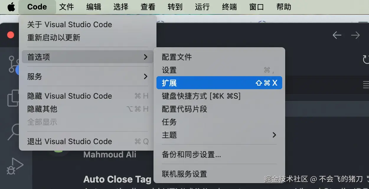 - 打开 VSCode,点击左侧活动栏中的「扩展」图标(四个方块组成的图标)。