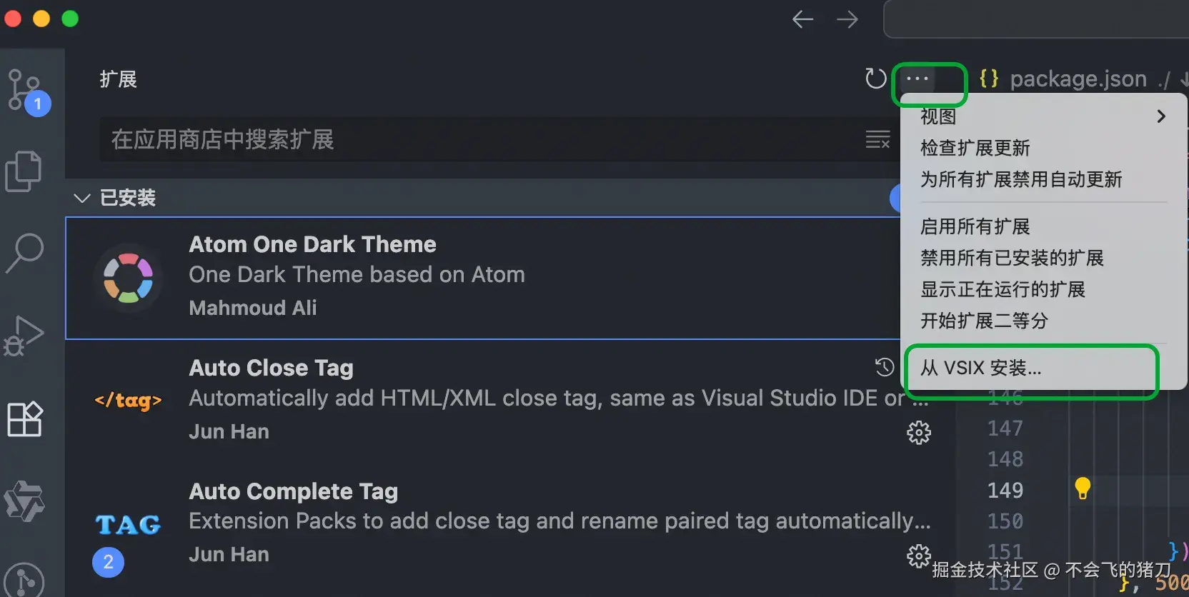 当处于无网络环境,或需要测试未发布的插件版本时,可通过 .vsix 文件手动安装。
