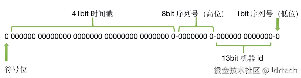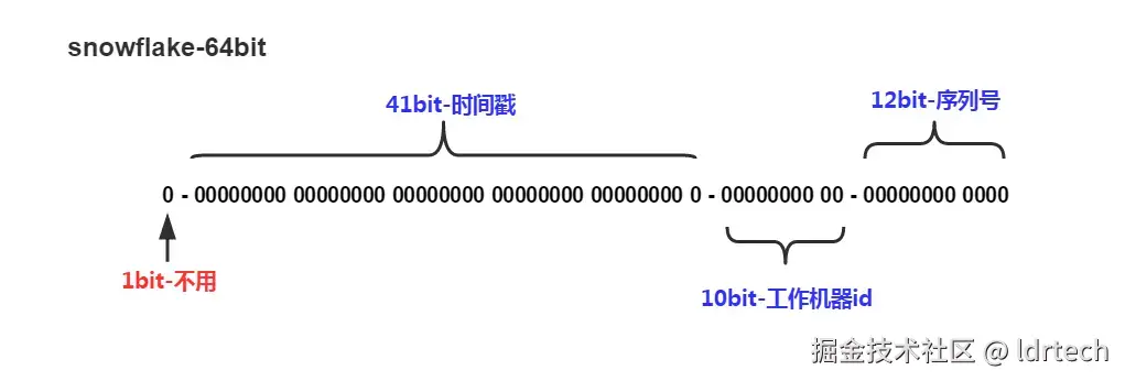 1位,符号位不用,二进制中最高位为1的都是负数,id使用整数,最高位固定是041位,用来记录时间戳(毫秒),最大值为2^41-1,约等于69.7年10位,用来记录工作机器id,最多为2^10= 1024个节点,10位中包括5位的datacenterId和5位的workerId,实际使用中不用区分datacenterId和workerId,只需保证工作机器id分配唯一即可12位,序列号,用来记录同毫秒内产生的不同id,可表示4096个数,即1毫秒内同一机器最大处理4096请求