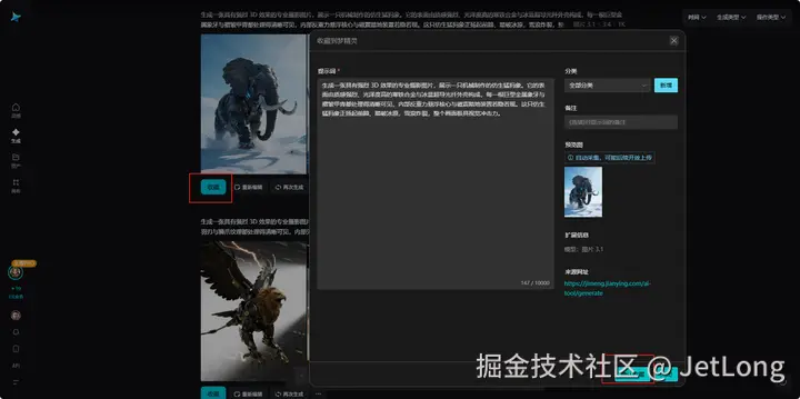 遇到想分享的提示词(比如在即梦ai、可灵里,安装了浏览器插件后,可以一键采集提示词+图片 作为素材),不用再反复切换页面复制,也不用手抄怕遗漏参数。点一下“收藏”,系统自动保存完整内容,包括风格描述、细节参数,后续直接调用,3秒搞定素材储备。