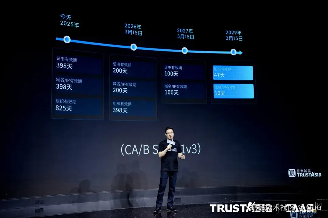 自 2012 年起,公信 TLS/SSL 证书的最长有效期便踏上了持续缩短的旅程。2023 年,Google 率先提出将 TLS/SSL 证书有效期缩短至 90 天,2025 年 4 月,CA/B 论坛正式通过 SC-081 提案,TLS/SSL **证书的最长有效期将在 2029 年 3 月 15 日缩短至 47 天,**域名验证有效期更加同期缩短至 10 天。