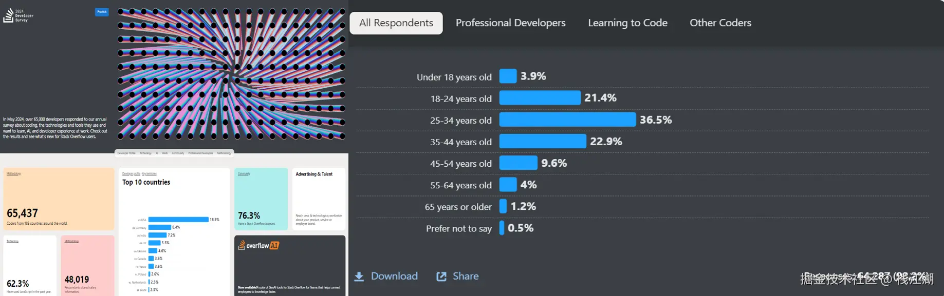 2024年调查大多数开发者年龄在 25 到 34 岁之间,占比为 37%,对于专业开发者来说,这一比例上升到了 42%,也就是说35岁以下程序员占整个程序员比例的近70% 的样子,25~34岁程序员才是主力军。