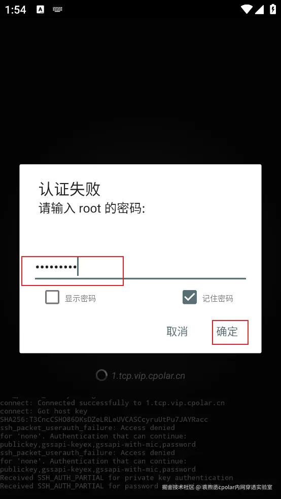 固定好了地址后,我们打开JuiceSSH ,使用我们固定的地址进行连接,同样输入的时候按照:用户名@cpolar地址格式进行输入,输入完成点击确定