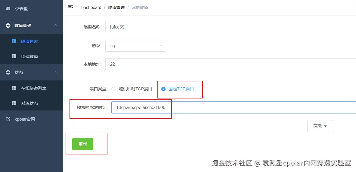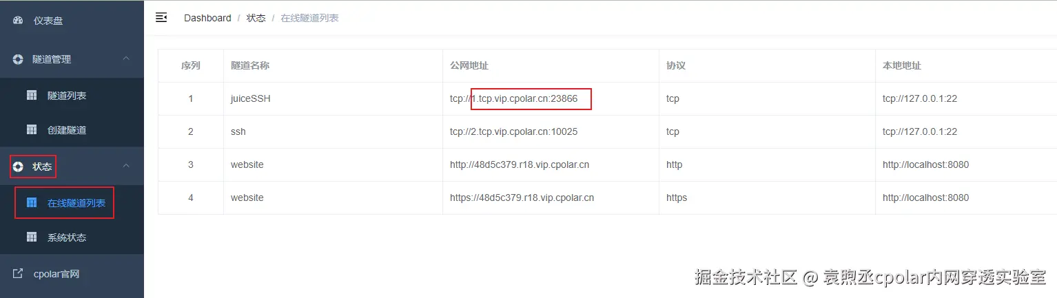 隧道更新成功后,点击左侧仪表盘的状态——在线隧道列表,可以看到公网地址已经更新成为了固定tcp地址。