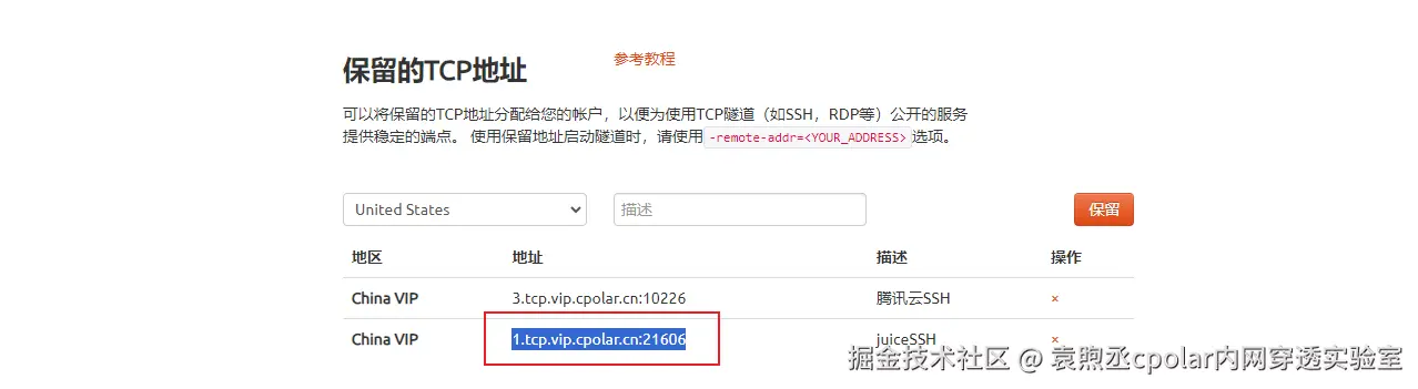 要注意的是,以上步骤使用的是随机临时tcp端口地址,所生成的公网地址为随机临时地址,该公网地址24小时内会随机变化。我们接下来为其配置固定的TCP端口地址,该地址不会变化,设置后将无需每天重复修改地址。