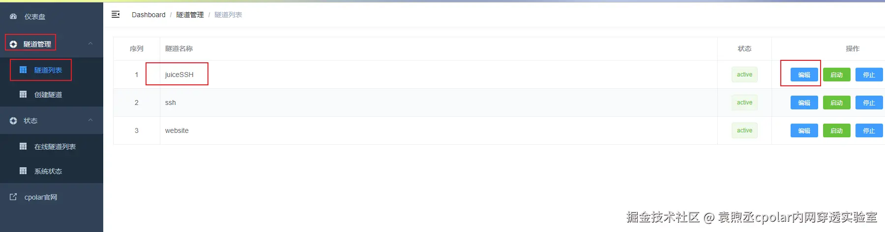 打开cpolar web ui管理界面,点击左侧仪表盘的隧道管理——隧道列表,找到我们上面创建的TCP隧道,点击右侧的编辑