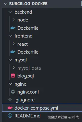 柏成通过 Docker 和 Docker Compose 实现了多容器化部署,包含后端服务、前端服务、数据库服务、redis服务以及 Nginx 服务,目录结构如下
