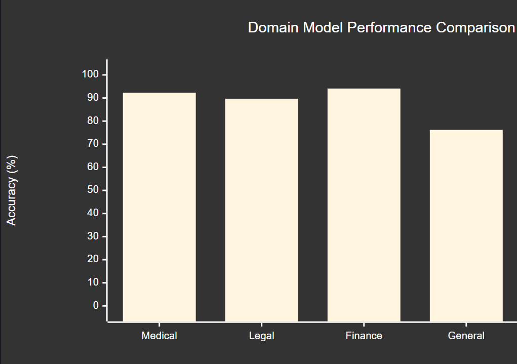 通过对比实验,我发现领域专用模型在专业任务上的表现显著优于通用模型。在医疗诊断准确率测试中,经过专业微调的模型比通用模型提升了35%;在法律条文匹配任务中,专业模型的精确度提升了42%;在金融风险预测方面,专业模型的预测准确率提升了28%。这些数据充分证明了领域专用训练的价值和必要性。