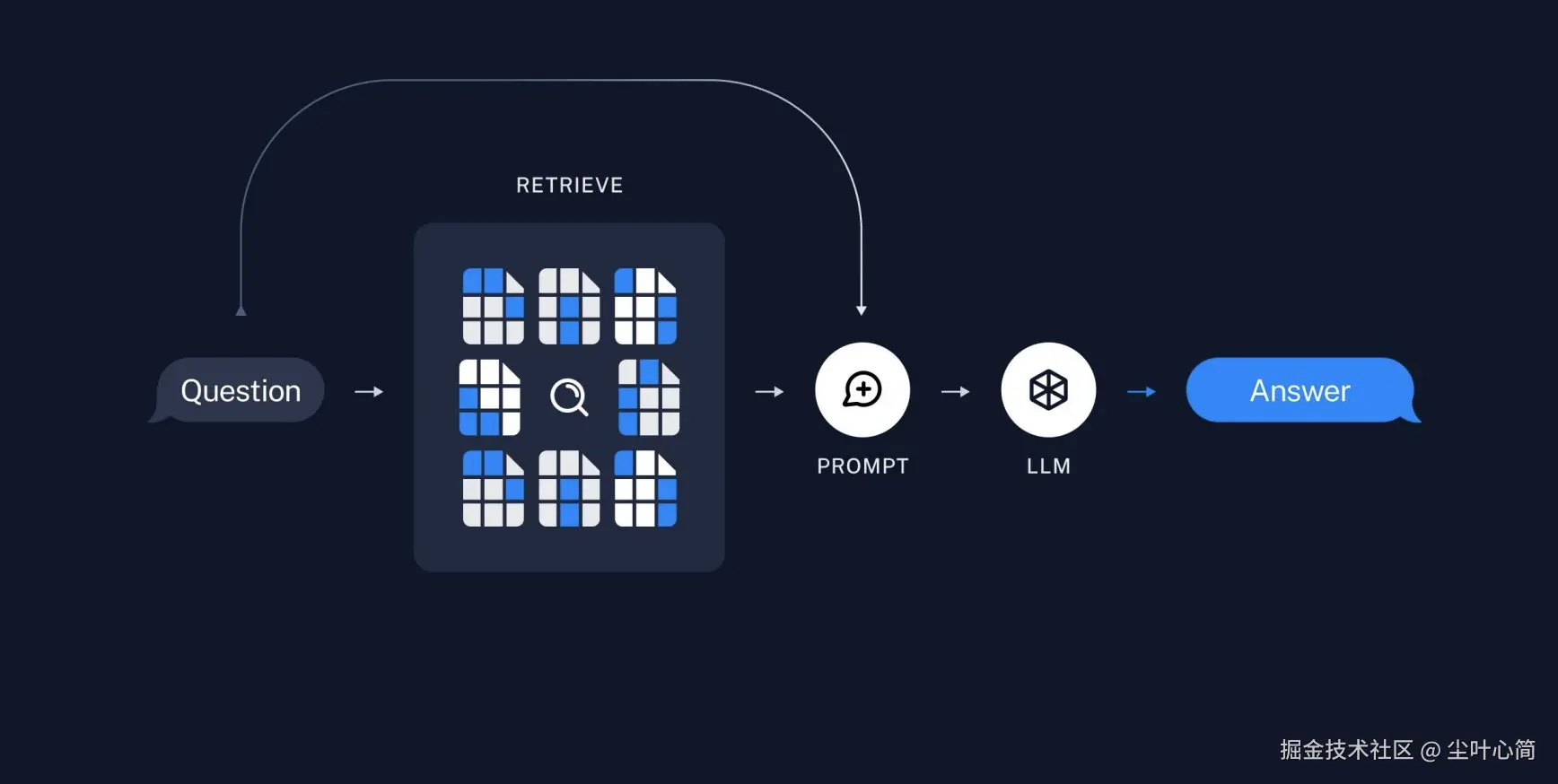 步骤: 1.检索:根据用户的输入,借助检索器从向量数据库中检索出相关的块 2.生成:LLM 使用包含问题答案的块进行问答