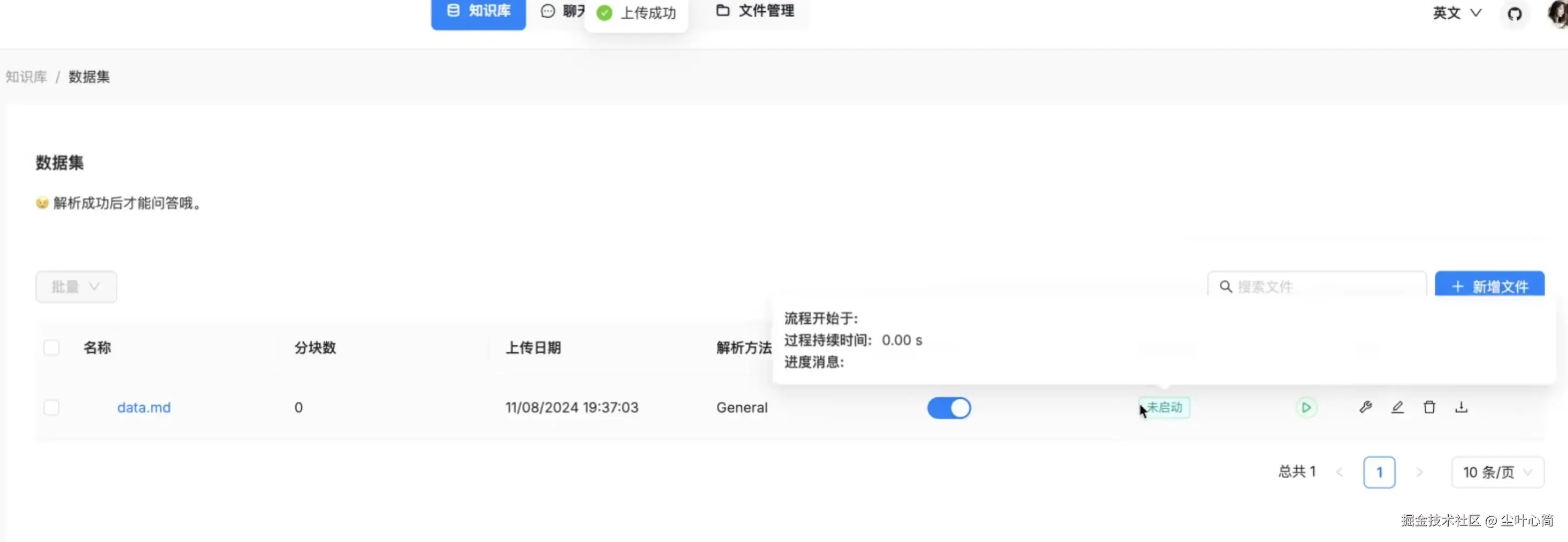 上传文件,点击“启动”按钮进行 Embedding,等待处理完成