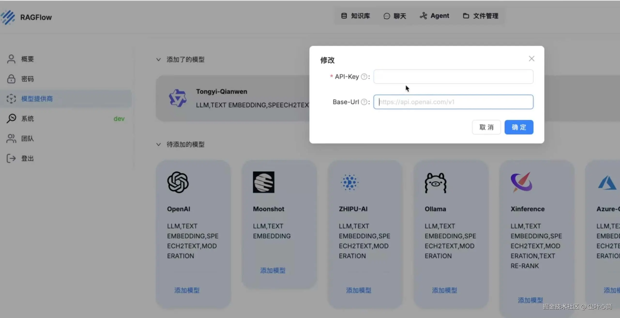 点击右上角头像,进入模型供应商设置,以 OpenAI 为例,点击添加模型,输入 Base URL 和 API KEY