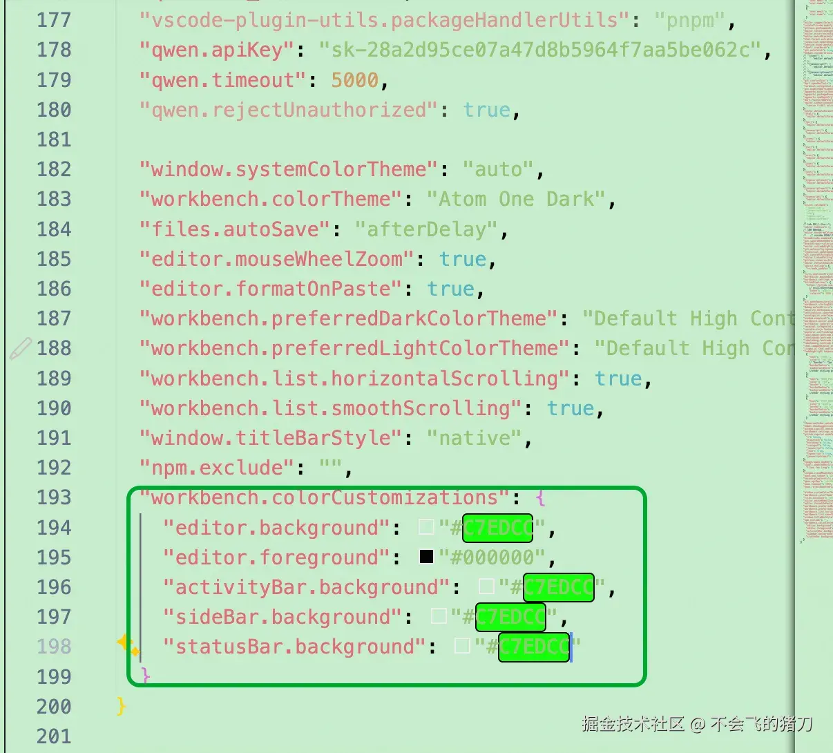 workbench.colorCustomizations配置项动态更新编辑器颜色,支持保留原有配置并扩展新设置。