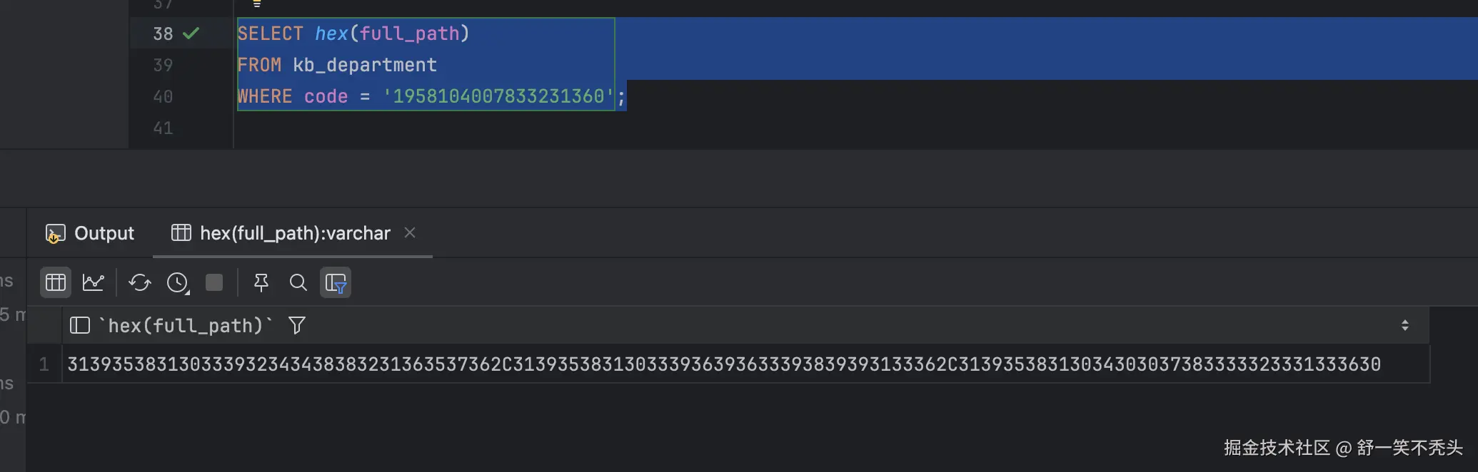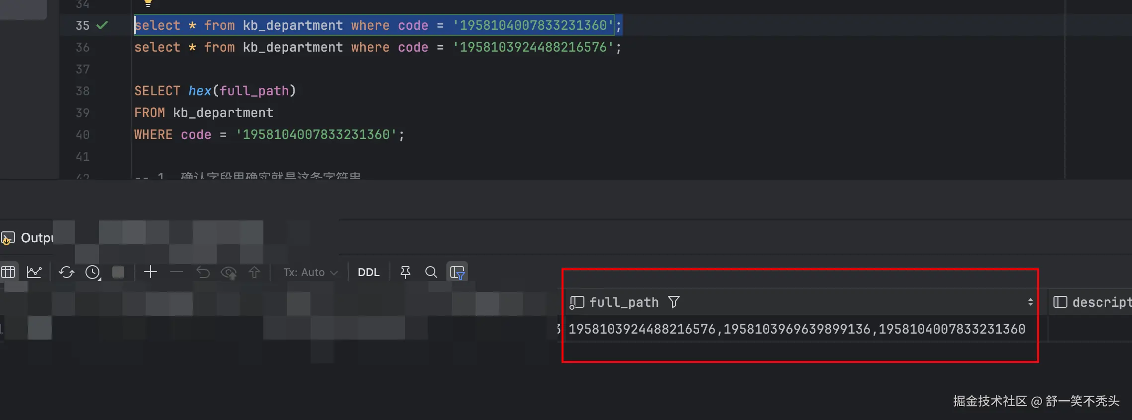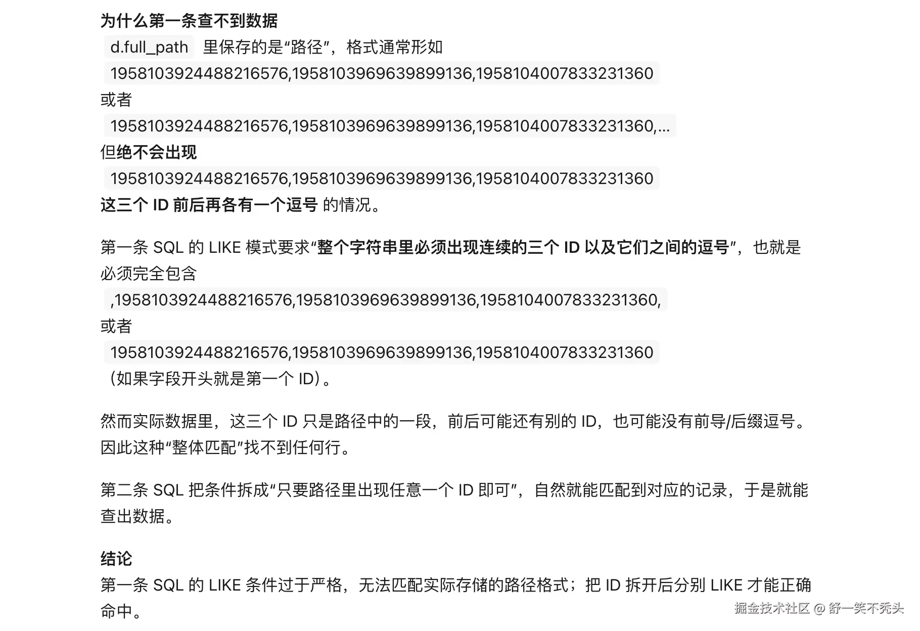 上述两个SQL,除了最后的full_path路径匹配规则不一样,其余都相同。上述两个SQL的效果是SQL1查询不出数据📊,SQL2可以查询出对于的数据。一开始看对着SQL的寓意进行分析没有发现明显的问题。。。。