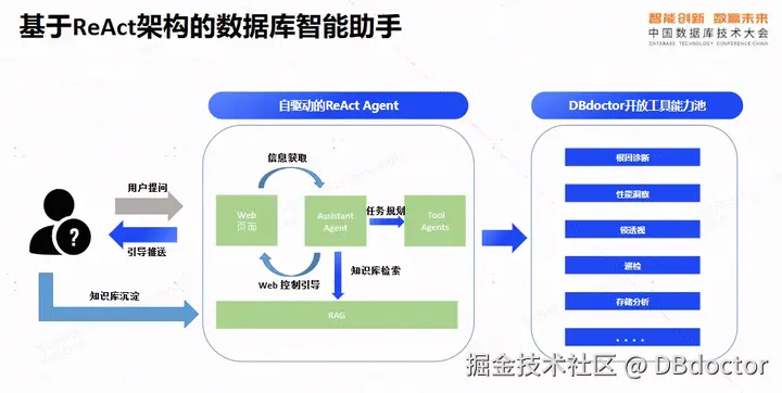 其中,自驱动的React智能体进一步由三个关键组件构成:Assistant Agent负责整体任务规划与决策;Tool Agent负责与DBdoctor开放能力池进行交互并调用相应服务;RAG(Retrieval-Augmented Generation)模块则负责知识检索与沉淀,增强系统对领域知识的利用能力。值得注意的是,Assistant Agent在执行任务规划时,不仅能够通过Tool Agent从平台获取数据,并访问知识库进行匹配,还可主动从Web界面提取实时信息,从而实现更动态和上下文感知的决策过程。