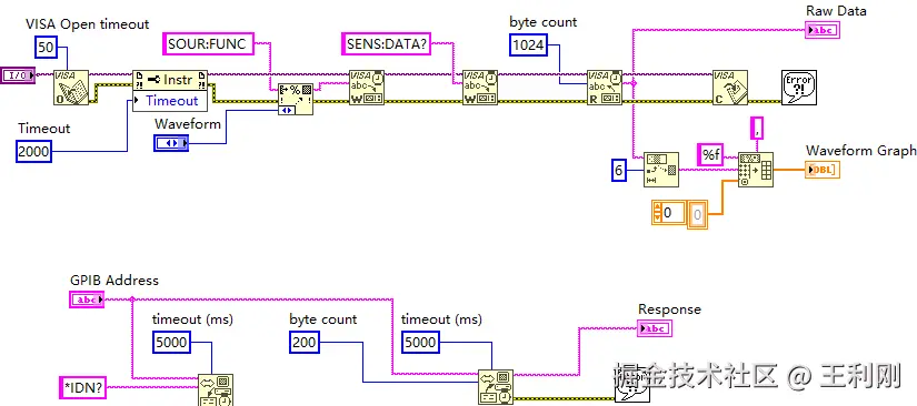 借 VISA Open 建通信会话,Property Node 配超时等属性,Format Into String 拼复杂指令(如SOUR:FUNC 拼接波形参数),VISA Write 发指令、VISA Read 读数据,经 Spreadsheet String to Array 解析为数值数组可视化,最后 VISA Close 释放资源,覆盖 “指令交互 - 数据处理” 全闭环,适配复杂控制(波形生成、参数动态调)。