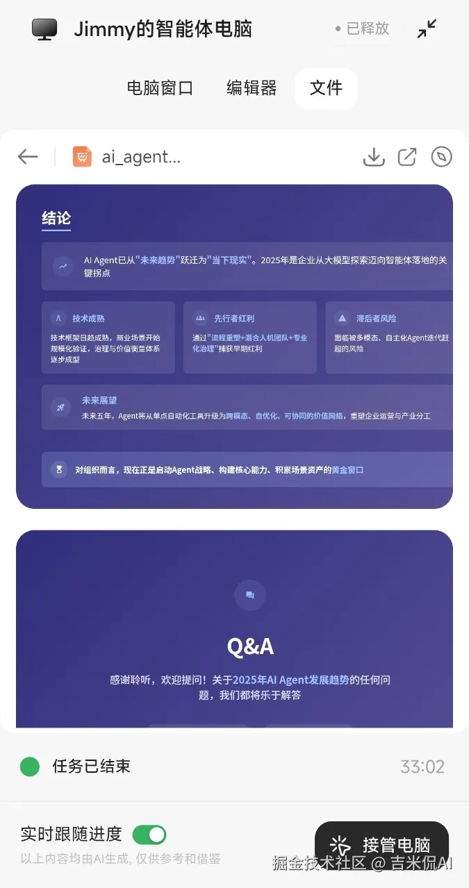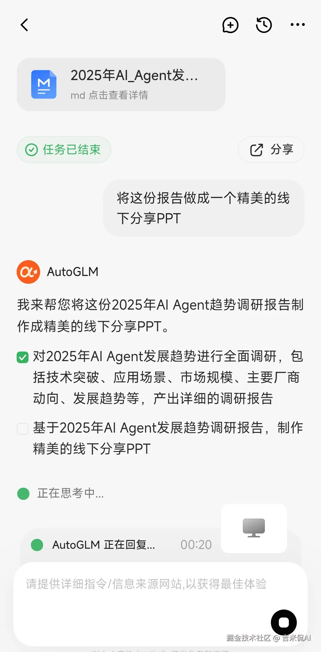 接下来,可以更进一步,要求AutoGLM把文字的结果输出一份PPT。