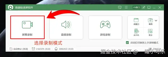 步骤1:在电脑桌面打开该软件后,会显示多种录制模式,选择所需模式即可。本次将以首个 “屏幕录制” 模式为例进行说明。