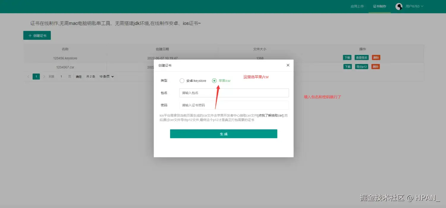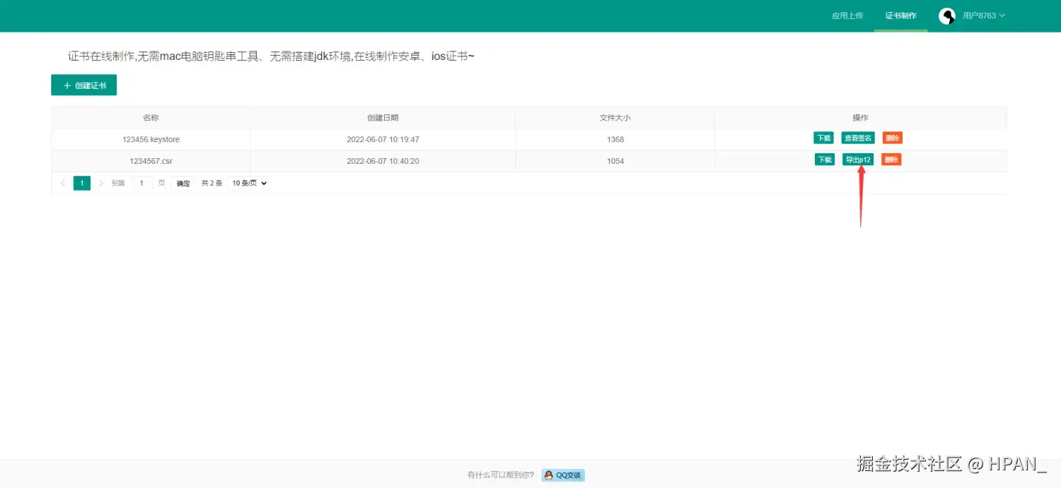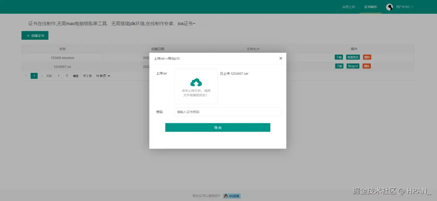 上传后,设置个证书密码就可以导出p12文件了