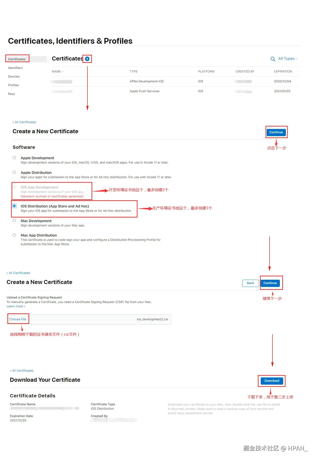 - 选择第一步生成的【Certificates证书】,点击【Continue】