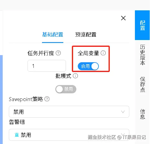 创建一个 Flink Sql 作业来执行上述脚本。然后就可以在查看界面看到创建的 Catalog 。虽然我们创建的是名为 my_catalog 的 catalog ,但是由于 type 参数是 dinky_mysql ,所以 dinky 会将其名字改为 my_catalog_dinky_mysql ,如下图右侧红框处(左侧红框处的禁用要改成DefaultCatalog) 。