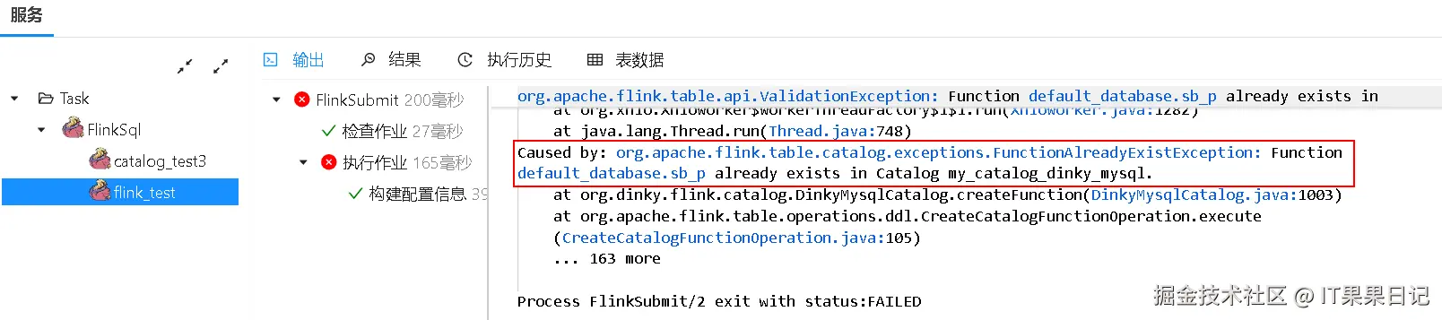 控制台日志会输出报错信息,提示Catalog my_catalog_dinky_mysql中已经存在函数sb_p 。所以我们修改一下代码,将注册函数的语句加一个关键字**TEMPORARY** 。它的意思是这个函数是临时的。