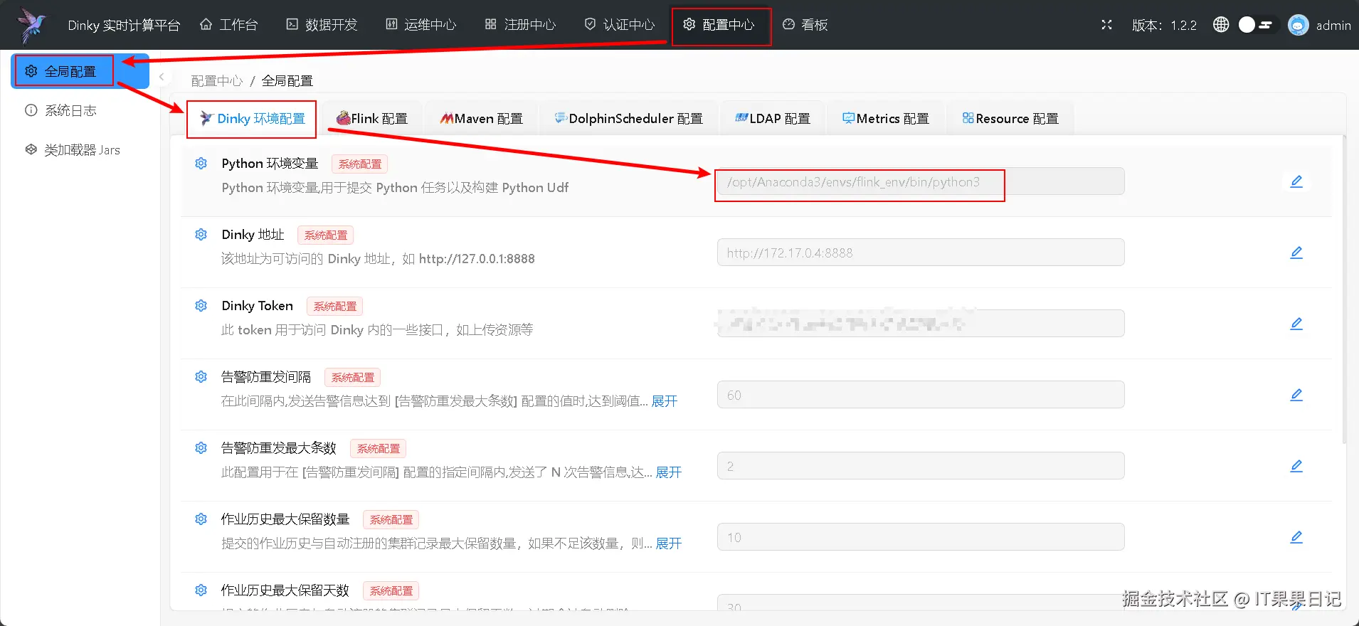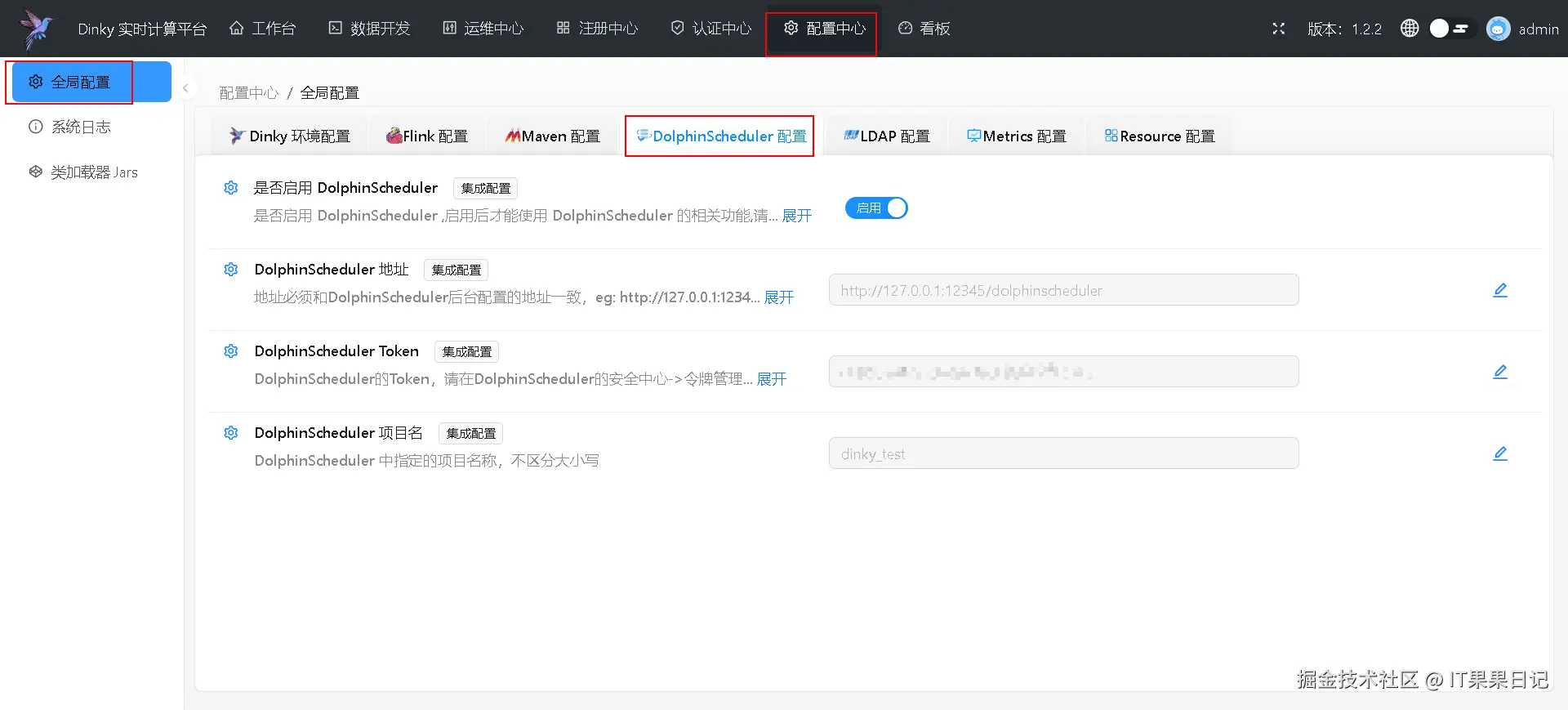 重新回到 dinky 页面,进入顶部菜单 配置中心 ,点击左侧菜单 全局配置 ,选择 DolphinScheduler 配置 标签页,启用开关,按照提示填写 DolphinScheduler 相关信息,特别是 Token 一栏要填写刚才在DolphinScheduler 里创建的令牌。